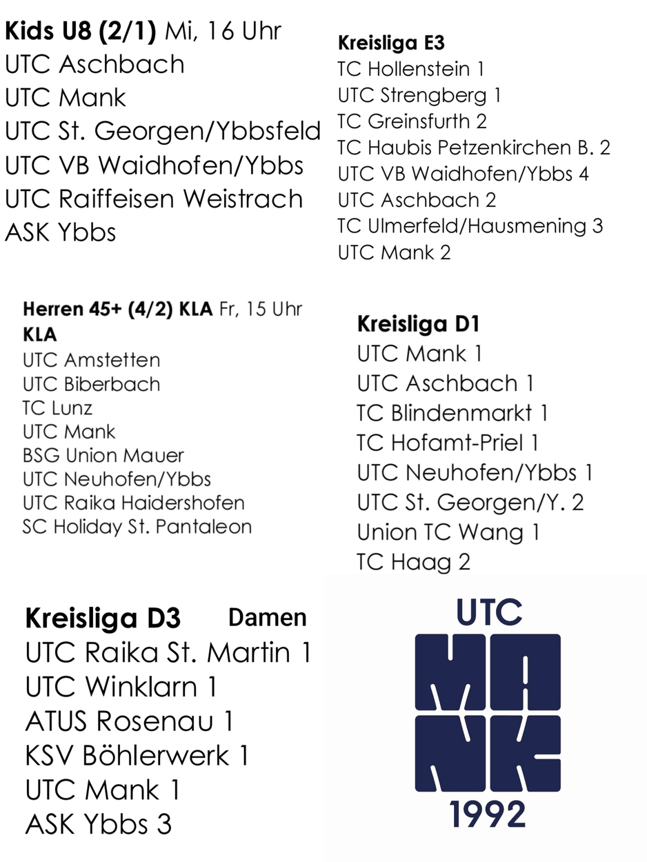 Mit insgesamt 5 Mannschaften steigt der UTC Mank in den kommenden Meisterschaftsbetrieb ab Mai ein. Besonders stolz ist man auf die Kids der U8, die sich in Spielen gegen andere Vereine messen. Diesem Vergleich stellen sich auch die UTC Damen in der allgemeinen Klasse. Wir freuen uns schon auf spannende Spiele und euren Besuch!